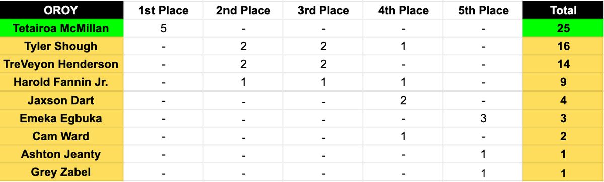 Tetairoa McMillan takes home the OROY in a clean sweep, though Tyler Shough certainly made it interesting down the stretch. McMillan’s production was simply too consistent to ignore—he was the class' only 1,000-yard receiver, finishing his campaign with a 70/1,014/7 stat line. Meanwhile, the voting distribution raised some eyebrows. Ashton Jeanty appeared on only one ballot despite pacing all rookies in scrimmage yards (1,321), and RJ Harvey didn't receive a single vote, which is a shocker considering he led all first-year players with 12 touchdowns.