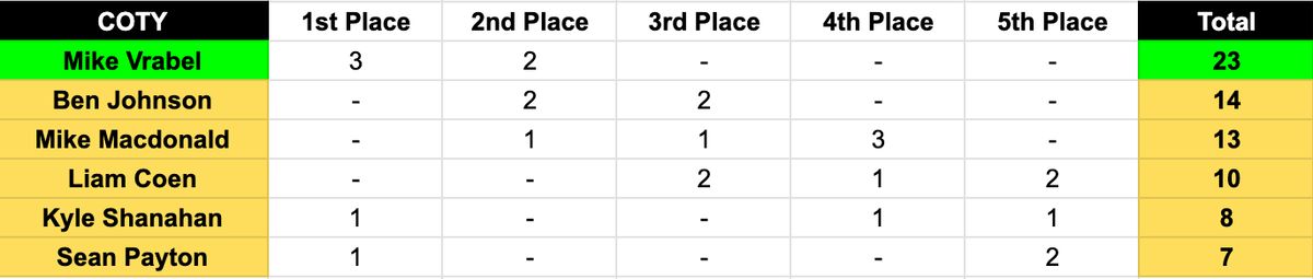 Just like you’d expect, the MVP race turned into an absolute dogfight between Matthew Stafford and Drake Maye. Not a single other player managed to snag a first- or second-place vote. In the end, Stafford’s absurd 46:8 TD-to-INT split was enough to earn him the nod. People will keep arguing about strength of schedule until they're blue in the face, but the truth is, both of these guys played well enough to take home the award.